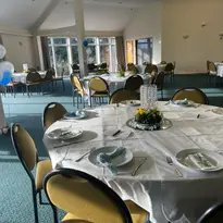 Fran celebrated her 80th with friends and family at a private function within a resturant. Her favourite colour is blue so there were blue table runners and blue napkins placed on the round tables.