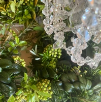 The table centerpieces were of two designs. One was a bespoke crystal lamp that we created ourselves with fresh florals underneath. The white roses, freshias and yellow daffidols added a beautiful fragrance. The arrangement was placed on top of a round mirror and scattered with acyrlic ice so that more light bounced around the arrangment.
