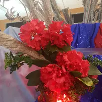 On the tables we designed simple, yet elegant posies with red and white roses, along with bright blue ribbon so that the school colours were again replicated in these arrangements. Red and blue lights were added for dramatic effect.