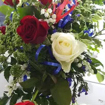 On the tables we designed simple, yet elegant posies with red and white roses, along with bright blue ribbon so that the school colours were again replicated in these arrangements.
