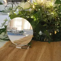 Tayla and Tylar had 100 guests seated at square tables. The hessian table runner contrasted beautifully with the white linen table cloth. The floral centerpiece was positioned atop a shinny round mirror. This reflected the water that was so important to Tayla & Tyler through the three-tiered cylinder vases with different water levels for the floating candles. The bottom of the vase held acrylic ice that also diffused the light and reflections. This rich setting with sparkling details ensured a lavish, chic and luxurious setting to depict a "glam wedding" style.